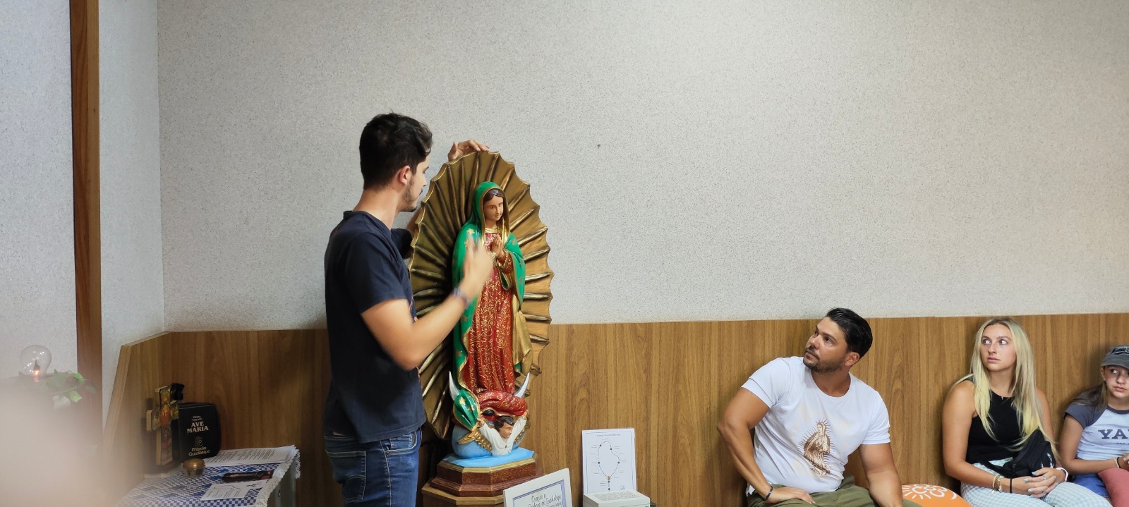 Por meio das explicações de Paulo Santiago e Jonas a família ouviu e se emocionou com a história da padroeira da Missão Guadalupe. Todos os detalhes, desde a explicação da flor de “Nahui Ollin” , símbolo presente no manto de Nossa Senhora, utilizado como logomarca da Missão até a aparição ao indígena Juan Diego, em 1531, foram  passados a eles.